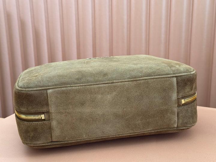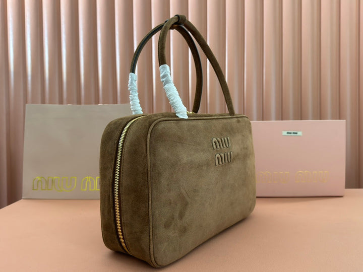 BEAU TOP HANDLE BAG 34 IN COFFEE BROWN SUEDE EMBOSSED LOGO