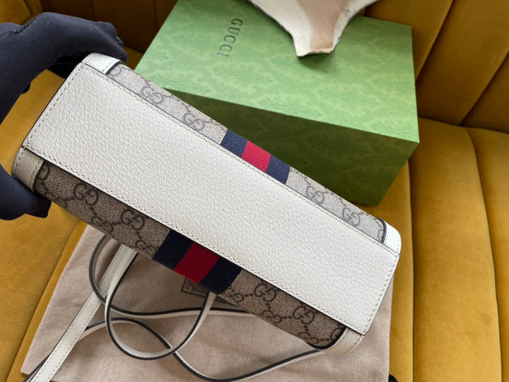 GG OPHIDIA 24 TOTE IN BEIGE CANVAS AND WHITE CALFSKIN