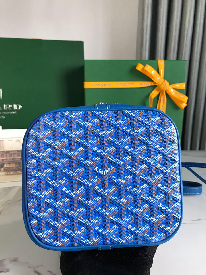 PETIT FLOT BUCKET BAG 22 IN SAPPHIRE BLUE GOYARDINE CANVAS AND LAMBSKIN TRIM