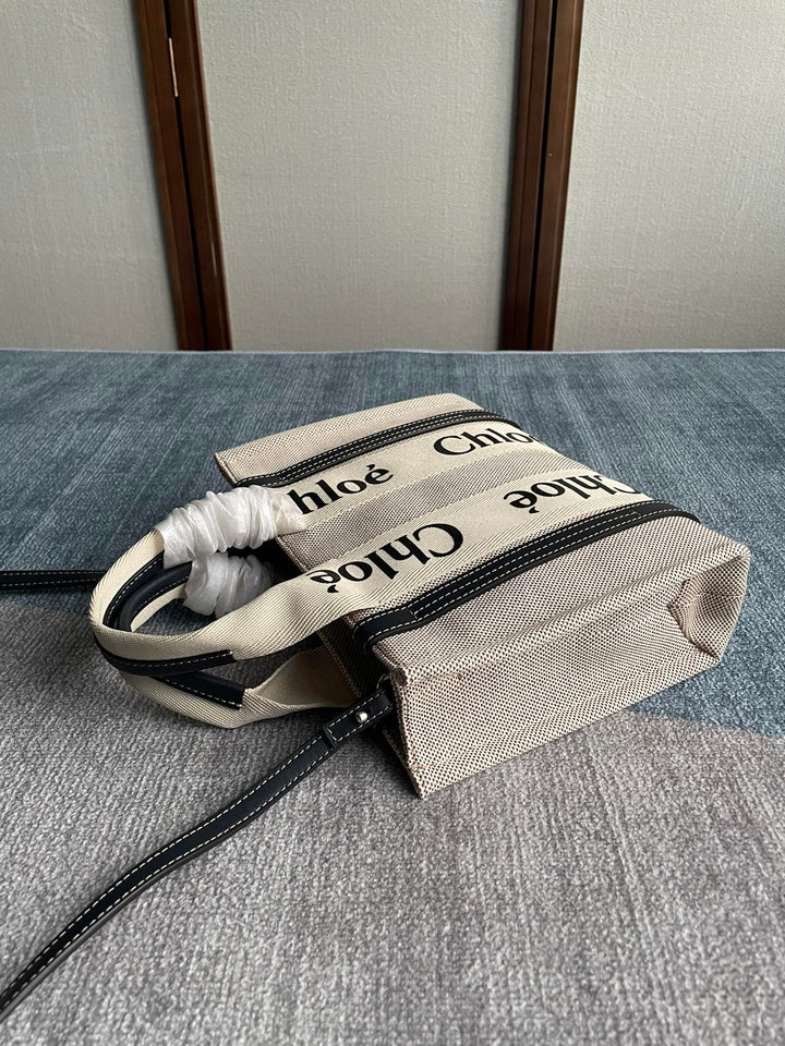 SMALL STRAP WOODY TOTE BAG 26.5 IN BEIGE LINEN CANVAS BLACK WEBBING LOGO EMBROIDER BLACK CALFSKIN