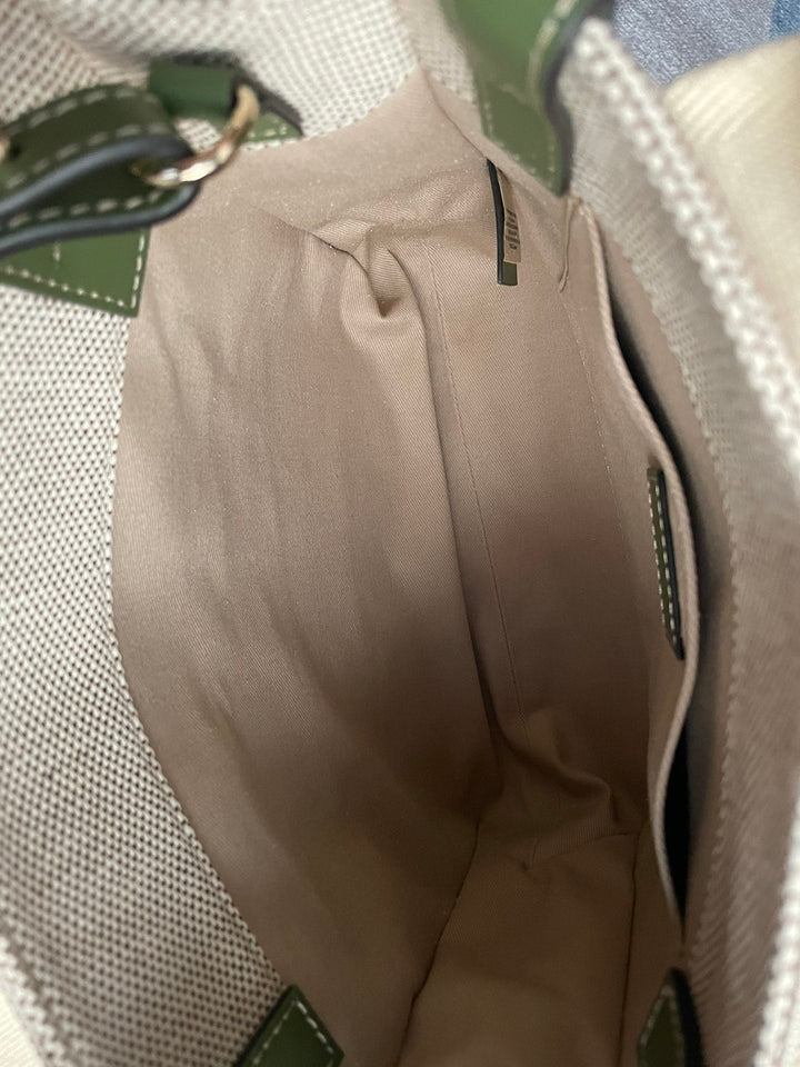 SMALL STRAP WOODY TOTE BAG 26.5 IN BEIGE LINEN CANVAS BLACK WEBBING LOGO EMBROIDER GREEN CALFSKIN