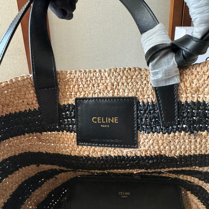 STRIPED COUFFIN CLASSIC PANIER 22 IN BEIGE AND BLACK RAFFIA AND CALFSKIN TRIM